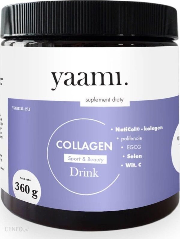 Collagen drink sport&beauty YaamiYaami Collagen drink sport & beauty — drink kolagenowyPyszny w smaku drink kolagenowy do samodzielnego przygotowania. Po prostu zmieszaj z wodą i ciesz się malinowo-żurowaniowym koktajlem. Kolagen Yaami Sport&beauty to nutraceutyczna formuła bazująca na najwyższej jakości kolagenie rybim, witaminie C oraz ekstrakcie z zielonej herbaty i biomasie z drożdży. Kolagen rybi swoją strukturą oraz składem jest najbardziej zbliżony do ludzkiego.Receptura została oparta na bazie wysokiej jakości kolagenu rybiego NatiCol® z dodatkiem drożdży Yarrowia lipolytica oraz najwyższej jakości ekstraktów roślinnych. Odpowiednie połączenie tych składników wspiera uzyskanie jędrnej i pełnej zdrowia skóry lśniących i sprężystych włosów oraz mocnych i pełnych blasku paznokci. Produkt ten to prawdziwa bomba witamin oraz substancji odżywczych stworzona z troską o wsparcie w zakresie beauty & sport.NatiCol® to zastrzeżona i opatentowana formuła. Cząsteczki tego kolagenu mają średnią masę cząsteczkową 4000 daltonów. Jest to mniejsza wartość niż granica przenikalności jelita, dzięki czemu cechuje się bardzo wysoką przyswajalnością.Składniki: zagęszczony sok z żurawiny, NatiCol® – hydrolizat kolagenu rybiego, zagęszczony sok z buraka, zawierająca selen biomasa drożdży Yarrowia lipolytica, naturalny aromat malina-żurawina, ekstrakt z dzikiej róży (Rosa canina), ekstrakt z zielonej herbaty (Camellia sinensis), substancja słodząca (sukraloza), biotyna.Składniki odżywczeW porcji dziennej% RWSNatiCol® – hydrolizat kolagenu rybiego3000 mg**Ekstrakt z dzikiej róży , w tym:- witamina C500 mg350 mg**438%Zawierająca selen biomasa drożdży Yarrowia lipolytica, w tym:- selen500 mg100 µg**182%Ekstrakt z zielonej herbaty, w tym: – polifenole- EGCG40 mg40 mg30 mg******Biotyna 500 µg1000%*RWS – Referencyjna wartość spożycia.** – Brak referencyjnej wartości spożycia.Dzienna porcja produktu: 2 razy po 6 g. Nie należy przekraczać zalecanej dziennej porcji.Suplement diety nie może być stosowany jako substytut (zamiennik) zróżnicowanej diety. Zróżnicowany sposób żywienia i zdrowy tryb życia są ważne.Sposób podania: porcje produktu (6 g) rozpuścić w 200 ml wody. Spożywać 2 razy dziennie, bezpośrednio po przygotowaniu. Opakowanie zawiera miarkę. 1 opakowanie to 30 dni.Produkt nie zawiera: sztucznych przeciwutleniaczy, konserwantów, barwników, aromatów, alergenów.Produkt zawiera substancję słodzącą.Przechowywanie: Przechowywać w suchym i przewiewnym miejscu. Suplement diety powinien być przechowywany w sposób niedostępny dla małych dzieci.Uwagi: Nie stosować w przypadku uczulenia na jakikolwiek składnik preparatu.
