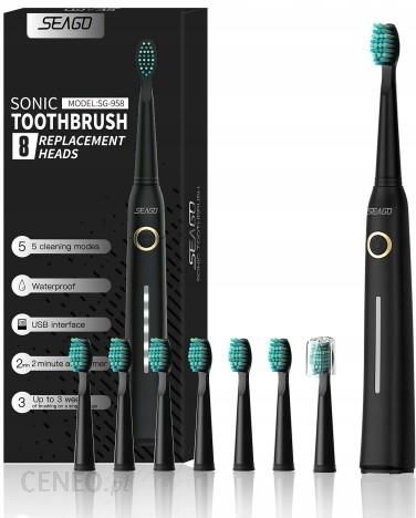 Na tej aukcji kupujesz szczoteczkę w kolorze czarnym, białe na innej aukcji. Opis SEAGO Szczoteczka soniczna (SG-958) czarna Szczoteczka Seago SG 958 Zdrowe i zadbane zęby to ważna wizytówka w codziennych relacjach z innymi ludźmi. Szczoteczka soniczna Seago SG 958 to doskonały wybór dla wszystkich osób, które pragną uzyskać najwyższą jakość profilaktyki i higieny jamy ustnej. Urządzenie posiada 5 programów szczotkowania oraz mocny akumulator, który pozwala na wiele dni pracy bez konieczności ładowania. Zestaw zawiera: Szczoteczkę soniczną SeaGo SG-958 Zestaw 8 wymiennych głowic Kabel ładujący Oryginalne opakowanie Dlaczego szczoteczka Seago ? Szczoteczki soniczne to obecnie najlepszy sposób w dokładnej i precyzyjnej higienie jamy ustnej. W odróżnieniu od szczoteczki elektrycznej wykorzystują ruchy omiatające, które pozwalają na lepsze czyszczenie okolic międzyzębowych oraz trudnodostępnych miejsc. Zakres pracy oferowany przez szczoteczkę Seago SG958 pozwala na dokładniejsze usuwanie kamienia i płytki nazębnej, zmniejsza ryzyko próchnicy, a także skutecznie eliminuje przebarwienia. Użytkownicy mają do wyboru kilka rodzajów nakładek z różnym ułożeniem i miękkością włosia. To kolejny czynnik, który pozwala na lepsze dostosowanie szczoteczki do naszych indywidualnych potrzeb. Precyzyjne i dokładne mycie ze szczoteczką soniczną Seago SG958 pozwoli Ci zachować piękny, śnieżnobiały uśmiech, a także skutecznie zmniejszą liczbę mało przyjemnych wizyt u dentysty. To propozycja skierowana do najbardziej wymagających osób. Wytrzymała bateria w szczoteczce sonicznej SG958 Szczoteczka posiada wbudowany akumulator o pojemności 260mAh. Wysoki poziom ergonomii pracy sprawia, że urządzenie pozwala na pracę do 21 dni bez ładowania. Akumulator możemy ładować za pośrednictwem standardowego kabla USB. Wytrzymała bateria, a także wygodny sposób ładowania sprawiają, że urządzenie świetnie sprawdza się zarówno w domu, jak również na wyjeździe. SG-958 – 5 programów szczotkowania zębów Lepsze dopasowanie szczoteczki do indywidualnych potrzeb umożliwiają różnorodne programy. Szczoteczka soniczna Seago SG958 posiada 3 podstawowe tryby pracy (mycie, wybielanie, masaż) oraz 2 programy ze zmienną prędkością oraz naciskiem główki. W sumie otrzymujemy 5 programów pozwalających na uzyskanie maksymalnej efektywności w codziennej higienie jamy ustnej. Głowica pozwala na uzyskanie nawet 40000 ruchów wymiatających na minutę. Taki zakres pracy umożliwia dużo wydajniejsze usuwanie płytki nazębnej, a także oczyszczanie nieestetycznych przebarwień. Szczoteczka Soniczna SG 958 – parametry techniczne · Marka i model: Szczoteczka soniczna Seago SG958 · Częstotliwość drgań:Regulowana, do 40000 RPM · Tryb pracy:5 programów (Mycie, wybielanie, masaż x 2 tryby prędkości) · Akumulator:260mAh (do 21 dni pracy bez konieczności ładowania) · Napięcie:0,5W · Zasilanie:3,7V / 1A · Ładowanie:kabel USB · Certyfikaty:FDA, FC, CE, IPX6, RoHS